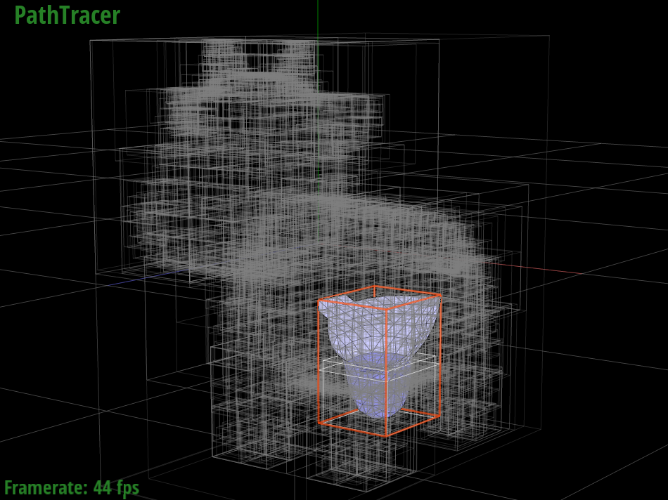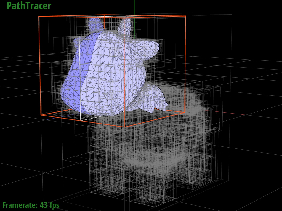 But, how do we determine the bounding box of primitives? We can't just bound an entire model, for that is useless and would force the intersection of everything inside it, which is already a lot! "Bounding Volume Hierarchy" suggest that we break down grids of primitives into bounding boxes in a binary search tree like way. If we have a model cow, and we know that the back of the cow will never be seen in the rendering, then we split a bounding box by the length of the cow. The parent bounding box is the bounding box of the whole cow, but we can make the front part of the cow a left bounding child and the back of the cow the right bounding child. We instead check the children, determining whether a ray is going to intersect the primitives inside. If we continue this construction, splitting the model into smaller and smaller halves of bounding boxes, then more accurately we determine the intersecting primitives. Thus, we resursively construct a binary tree of bounding boxes, our bounding volume hierarchy.