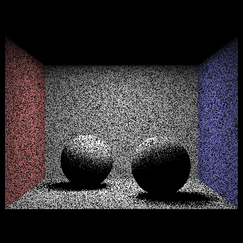 These results are already less noisy than the direct hemisphere sampling. In other words, there is a lot less variance: more intermediate values rather than dark specks. Remember that "ns_area_light" variable? We can increase/descrease that value to get different results. We can predict, since it represents the number of samples being made towards a light source, that it will enhance the importance sampling result. Below are the toggling of 1, 4, 16, and 64 samples.