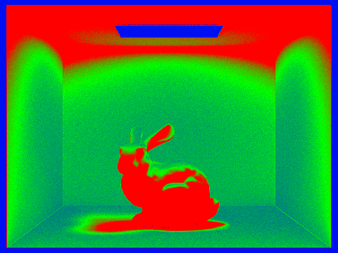 The red coloring indicates more high sampling at that area. Meanwhile, blue coloring represents low sampling at that area. Notice that the areas with the high sampling were the shadows of the bunny and the ceiling. These would need a lot of samples to really smooth out the different lighting and shadows, proof that we are probabily saving computing time using adaptive sampling with global illumination.